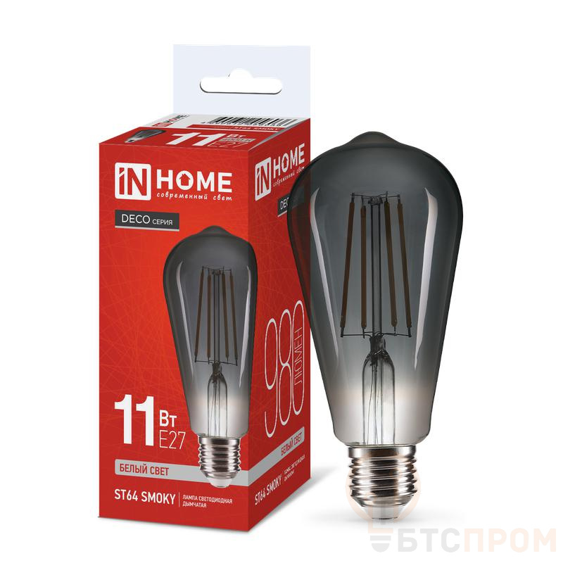 Филаментная лампа IN HOME LED-ST64-deco smoky 4690612056036 мощностью 11 Вт. Световой поток 980 лм. Нейтральный белый свет (4000К). Лампа формы "цилиндр" с дымчатой колбой и цоколем E27. Напряжение 230В. Цилиндрическая форма и дымчатый эффект для винтажного стиля.