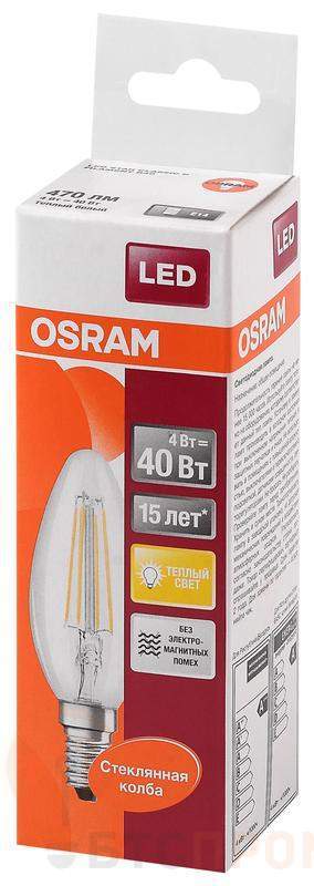 Лампа светодиодная филаментная OSRAM LEDSCLB40 4W/827 230V FIL E14 FS1 OSRAM, 470 лм, 4Вт (замена 40Вт), 2700К (теплый белый свет). Цоколь E14, колба B. Исполнение колбы прозрачное, стекло. Напряжение питания 220-240В. Товар сертифицирован.