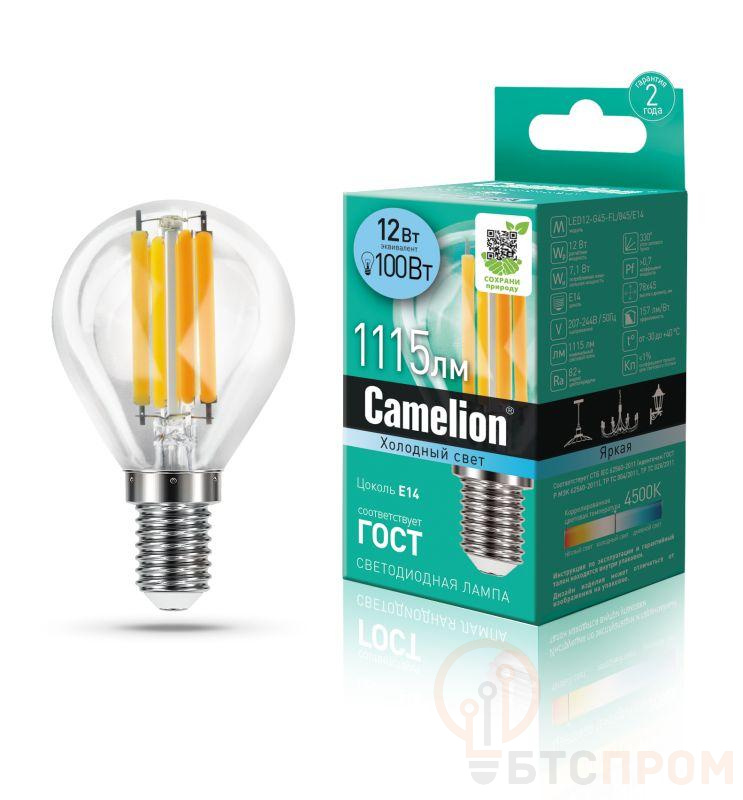 СДЛ Camelion - это инновационное решение, разработанное на основе новейших светодиодных технологий (LED). Предназначена для освещения жилых, офисных и коммерческих помещений. Встроенный источник питания позволяет использовать СДЛ Camelion в стандартных патронах. LED лампа, мощность, Вт - 12, напряжение, В - 207-244, световой поток, лм - 1115, форма колбы - шар, цвет колбы - прозрачный, цоколь E14, цветовая температура, К - 4500, угол светового пучка - 330, индекс цветопередачи 80+, срок службы, ч. - 30000