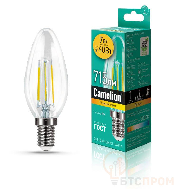 Лампа светодиодная филаментная LED7-C35-FL/830/E14 7Вт 220В Camelion 13452 фото в каталоге от BTSprom.by