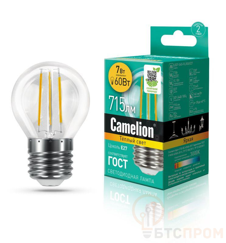 СДЛ Camelion - это инновационное решение, разработанное на основе новейших светодиодных технологий (LED). Предназначена для освещения жилых, офисных и коммерческих помещений. Встроенный источник питания позволяет использовать СДЛ Camelion в стандартных патронах. LED лампа, мощность, Вт - 7, напряжение, В - 207-244, световой поток, лм - 715, форма колбы - шар, цвет колбы - прозрачный, цоколь E27, цветовая температура, К - 3000, угол светового пучка - 330, индекс цветопередачи 80+, срок службы, ч. - 30000