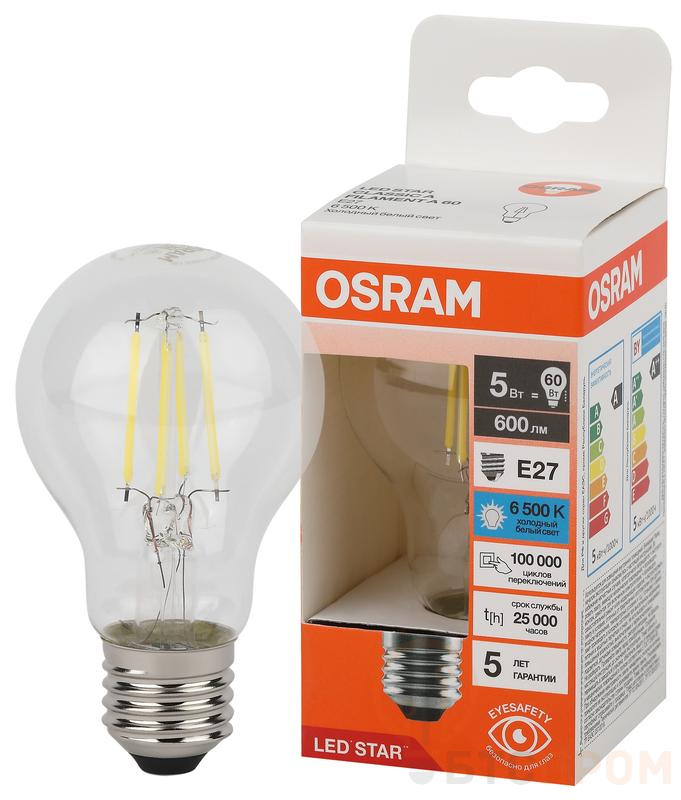 Лампа светодиодная филаментная LS CLA60 5W/865 230VFILCL 5Вт 6500К холод. бел. E27 600лм A угол пучка 300град. 220-240В (замена 60Вт) прозр. стекло OSRAM 4058075687691