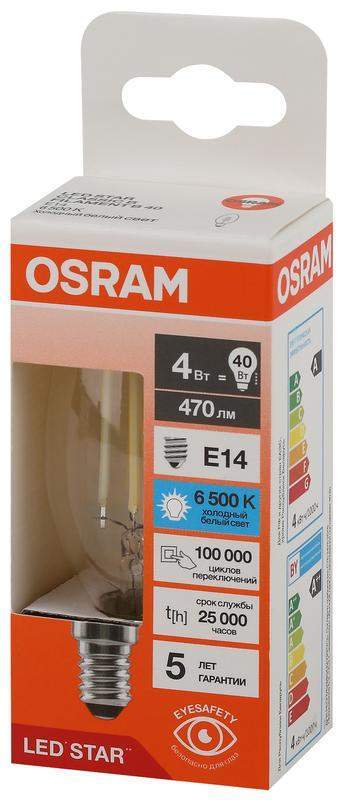 Светодиодные лампы OSRAM - разумная замена традиционным лампам накаливания или галогенным лампам. Светодиодные лампы OSRAM снижают затраты на освещение до 90% при сохранении привычного уровня освещенности. Эта лампа OSRAM серии LED Star выполнена в форме колбы B ("свеча") с цоколем E14. Материал колбы - стекло, исполнение - прозрачное. Световой поток 470 люмен, что соответствует лампе накаливания на 40 Вт. Это филаментная лампа прекрасно выглядит, а потому идеально подходит для открытых светильников и декоративного освещения. Эта лампа излучает холодный белый свет, угол пучка - широкий. Качество света на высоте: низкие пульсации защищают глаза, а высокий индекс цветопередачи позволяет видеть мир в его истинном цвете. Кроме того, лампы OSRAM полностью безопасны для здоровья, поскольку в них нет опасных материалов по европейскому стандарту RoHS, а также они не производят вредных электромагнитных излучений, что подтверждено ЭМС (сертификат электромагнитной совместимости). Лампа проработает долго: срок службы - 25000 часов, 5 года гарантии. Светодиодные лампы OSRAM - умный выбор для здоровья семьи и кошелька!