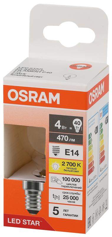 Светодиодные лампы OSRAM - разумная замена традиционным лампам накаливания или галогенным лампам. Светодиодные лампы OSRAM снижают затраты на освещение до 90% при сохранении привычного уровня освещенности. Эта лампа OSRAM серии LED Star выполнена в форме колбы P ("шарик") с цоколем E14. Материал колбы - стекло, исполнение - прозрачное. Световой поток 470 люмен, что соответствует лампе накаливания на 40 Вт. Это филаментная лампа прекрасно выглядит, а потому идеально подходит для открытых светильников и декоративного освещения. Эта лампа излучает теплый белый свет, угол пучка - широкий. Качество света на высоте: низкие пульсации защищают глаза, а высокий индекс цветопередачи позволяет видеть мир в его истинном цвете. Кроме того, лампы OSRAM полностью безопасны для здоровья, поскольку в них нет опасных материалов по европейскому стандарту RoHS, а также они не производят вредных электромагнитных излучений, что подтверждено ЭМС (сертификат электромагнитной совместимости). Лампа проработает долго: срок службы - 25000 часов, 5 года гарантии. Светодиодные лампы OSRAM - умный выбор для здоровья семьи и кошелька!
