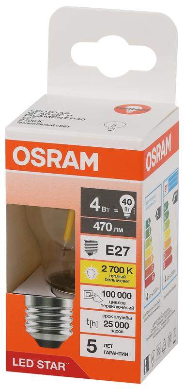 Светодиодные лампы OSRAM - разумная замена традиционным лампам накаливания или галогенным лампам. Светодиодные лампы OSRAM снижают затраты на освещение до 90% при сохранении привычного уровня освещенности. Эта лампа OSRAM серии LED Star выполнена в форме колбы P ("шарик") с цоколем E27. Материал колбы - стекло, исполнение - прозрачное. Световой поток 470 люмен, что соответствует лампе накаливания на 40 Вт. Это филаментная лампа прекрасно выглядит, а потому идеально подходит для открытых светильников и декоративного освещения. Эта лампа излучает теплый белый свет, угол пучка - широкий. Качество света на высоте: низкие пульсации защищают глаза, а высокий индекс цветопередачи позволяет видеть мир в его истинном цвете. Кроме того, лампы OSRAM полностью безопасны для здоровья, поскольку в них нет опасных материалов по европейскому стандарту RoHS, а также они не производят вредных электромагнитных излучений, что подтверждено ЭМС (сертификат электромагнитной совместимости). Лампа проработает долго: срок службы - 25000 часов, 5 года гарантии. Светодиодные лампы OSRAM - умный выбор для здоровья семьи и кошелька!