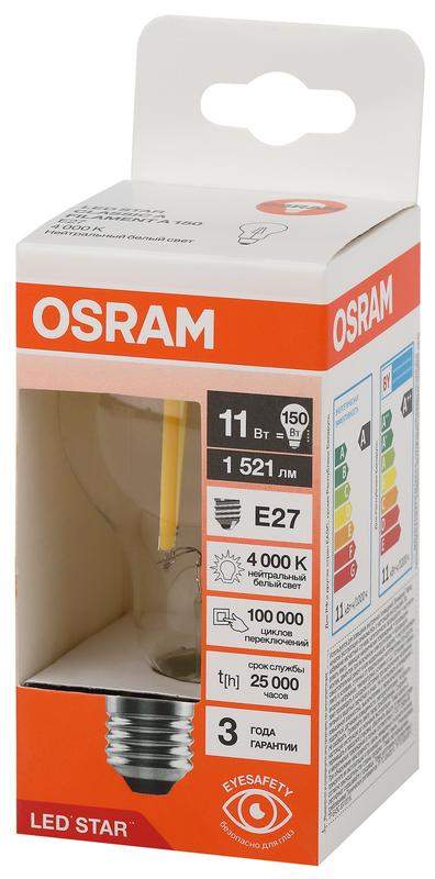 Лампа светодиодная филаментная LSCLA150 11W/840 230V FIL 11Вт 4000К нейтр. бел. E27 1521лм A угол пучка 300град. 220-240В (замена 150Вт) прозр. стекло OSRAM 4058075684249