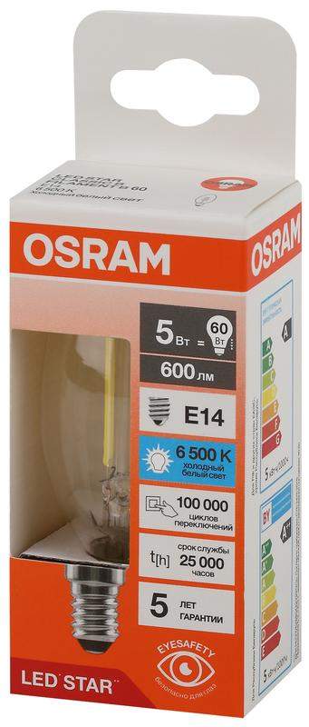 Светодиодные лампы OSRAM - разумная замена традиционным лампам накаливания или галогенным лампам. Светодиодные лампы OSRAM снижают затраты на освещение до 90% при сохранении привычного уровня освещенности. Эта лампа OSRAM серии LED Star выполнена в форме колбы B ("свеча") с цоколем E14. Материал колбы - стекло, исполнение - прозрачное. Световой поток 600 люмен, что соответствует лампе накаливания на 60 Вт. Это филаментная лампа прекрасно выглядит, а потому идеально подходит для открытых светильников и декоративного освещения. Эта лампа излучает холодный белый свет, угол пучка - широкий. Качество света на высоте: низкие пульсации защищают глаза, а высокий индекс цветопередачи позволяет видеть мир в его истинном цвете. Кроме того, лампы OSRAM полностью безопасны для здоровья, поскольку в них нет опасных материалов по европейскому стандарту RoHS, а также они не производят вредных электромагнитных излучений, что подтверждено ЭМС (сертификат электромагнитной совместимости). Лампа проработает долго: срок службы - 25000 часов, 5 года гарантии. Светодиодные лампы OSRAM - умный выбор для здоровья семьи и кошелька!