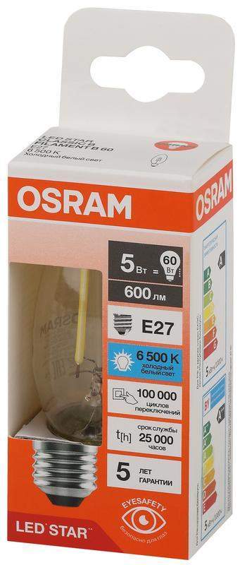 Светодиодные лампы OSRAM - разумная замена традиционным лампам накаливания или галогенным лампам. Светодиодные лампы OSRAM снижают затраты на освещение до 90% при сохранении привычного уровня освещенности. Эта лампа OSRAM серии LED Star выполнена в форме колбы B ("свеча") с цоколем E27. Материал колбы - стекло, исполнение - прозрачное. Световой поток 600 люмен, что соответствует лампе накаливания на 60 Вт. Это филаментная лампа прекрасно выглядит, а потому идеально подходит для открытых светильников и декоративного освещения. Эта лампа излучает холодный белый свет, угол пучка - широкий. Качество света на высоте: низкие пульсации защищают глаза, а высокий индекс цветопередачи позволяет видеть мир в его истинном цвете. Кроме того, лампы OSRAM полностью безопасны для здоровья, поскольку в них нет опасных материалов по европейскому стандарту RoHS, а также они не производят вредных электромагнитных излучений, что подтверждено ЭМС (сертификат электромагнитной совместимости). Лампа проработает долго: срок службы - 25000 часов, 5 года гарантии. Светодиодные лампы OSRAM - умный выбор для здоровья семьи и кошелька!