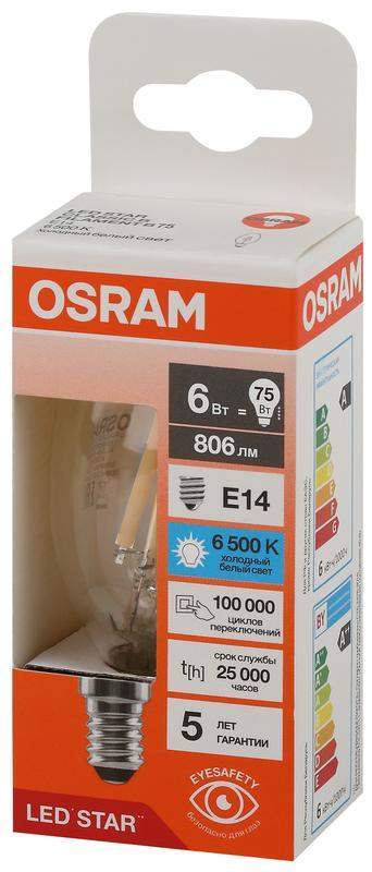 Светодиодные лампы OSRAM - разумная замена традиционным лампам накаливания или галогенным лампам. Светодиодные лампы OSRAM снижают затраты на освещение до 90% при сохранении привычного уровня освещенности. Эта лампа OSRAM серии LED Star выполнена в форме колбы B ("свеча") с цоколем E14. Материал колбы - стекло, исполнение - прозрачное. Световой поток 806 люмен, что соответствует лампе накаливания на 75 Вт. Это филаментная лампа прекрасно выглядит, а потому идеально подходит для открытых светильников и декоративного освещения. Эта лампа излучает холодный белый свет, угол пучка - широкий. Качество света на высоте: низкие пульсации защищают глаза, а высокий индекс цветопередачи позволяет видеть мир в его истинном цвете. Кроме того, лампы OSRAM полностью безопасны для здоровья, поскольку в них нет опасных материалов по европейскому стандарту RoHS, а также они не производят вредных электромагнитных излучений, что подтверждено ЭМС (сертификат электромагнитной совместимости). Лампа проработает долго: срок службы - 25000 часов, 5 года гарантии. Светодиодные лампы OSRAM - умный выбор для здоровья семьи и кошелька!