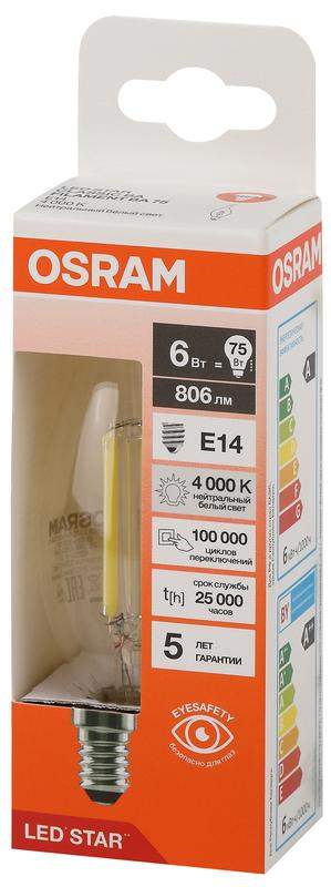 Лампа светодиодная филаментная LSCLBA75 6W/840 230VFILCL 6Вт 4000К нейтр. бел. E14 806лм BA угол пучка 300град. 220-240В (замена 75Вт) прозр. стекло OSRAM 4058075685024