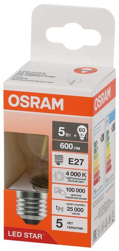 Светодиодные лампы OSRAM - разумная замена традиционным лампам накаливания или галогенным лампам. Светодиодные лампы OSRAM снижают затраты на освещение до 90% при сохранении привычного уровня освещенности. Эта лампа OSRAM серии LED Star выполнена в форме колбы P ("шарик") с цоколем E27. Материал колбы - стекло, исполнение - прозрачное. Световой поток 600 люмен, что соответствует лампе накаливания на 60 Вт. Это филаментная лампа прекрасно выглядит, а потому идеально подходит для открытых светильников и декоративного освещения. Эта лампа излучает нейтральный белый свет, угол пучка - широкий. Качество света на высоте: низкие пульсации защищают глаза, а высокий индекс цветопередачи позволяет видеть мир в его истинном цвете. Кроме того, лампы OSRAM полностью безопасны для здоровья, поскольку в них нет опасных материалов по европейскому стандарту RoHS, а также они не производят вредных электромагнитных излучений, что подтверждено ЭМС (сертификат электромагнитной совместимости). Лампа проработает долго: срок службы - 25000 часов, 5 года гарантии. Светодиодные лампы OSRAM - умный выбор для здоровья семьи и кошелька!