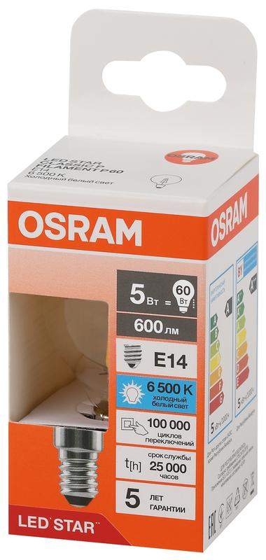 Светодиодные лампы OSRAM - разумная замена традиционным лампам накаливания или галогенным лампам. Светодиодные лампы OSRAM снижают затраты на освещение до 90% при сохранении привычного уровня освещенности. Эта лампа OSRAM серии LED Star выполнена в форме колбы P ("шарик") с цоколем E14. Материал колбы - стекло, исполнение - прозрачное. Световой поток 600 люмен, что соответствует лампе накаливания на 60 Вт. Это филаментная лампа прекрасно выглядит, а потому идеально подходит для открытых светильников и декоративного освещения. Эта лампа излучает холодный белый свет, угол пучка - широкий. Качество света на высоте: низкие пульсации защищают глаза, а высокий индекс цветопередачи позволяет видеть мир в его истинном цвете. Кроме того, лампы OSRAM полностью безопасны для здоровья, поскольку в них нет опасных материалов по европейскому стандарту RoHS, а также они не производят вредных электромагнитных излучений, что подтверждено ЭМС (сертификат электромагнитной совместимости). Лампа проработает долго: срок службы - 25000 часов, 5 года гарантии. Светодиодные лампы OSRAM - умный выбор для здоровья семьи и кошелька!