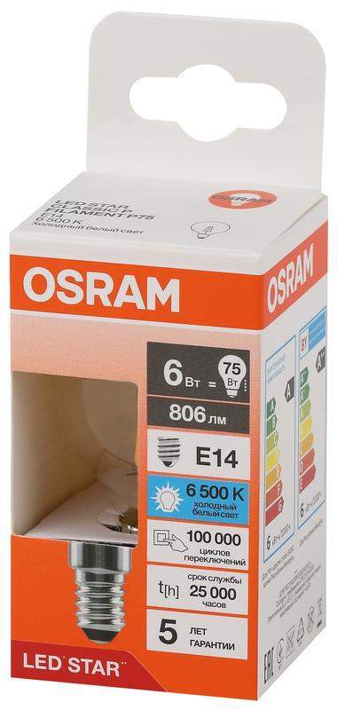Светодиодные лампы OSRAM - разумная замена традиционным лампам накаливания или галогенным лампам. Светодиодные лампы OSRAM снижают затраты на освещение до 90% при сохранении привычного уровня освещенности. Эта лампа OSRAM серии LED Star выполнена в форме колбы P ("шарик") с цоколем E14. Материал колбы - стекло, исполнение - прозрачное. Световой поток 806 люмен, что соответствует лампе накаливания на 75 Вт. Это филаментная лампа прекрасно выглядит, а потому идеально подходит для открытых светильников и декоративного освещения. Эта лампа излучает холодный белый свет, угол пучка - широкий. Качество света на высоте: низкие пульсации защищают глаза, а высокий индекс цветопередачи позволяет видеть мир в его истинном цвете. Кроме того, лампы OSRAM полностью безопасны для здоровья, поскольку в них нет опасных материалов по европейскому стандарту RoHS, а также они не производят вредных электромагнитных излучений, что подтверждено ЭМС (сертификат электромагнитной совместимости). Лампа проработает долго: срок службы - 25000 часов, 5 года гарантии. Светодиодные лампы OSRAM - умный выбор для здоровья семьи и кошелька!