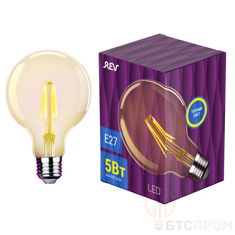 Филаментная лампа REV PREMIUM 32433 1 мощностью 5 Вт. Световой поток 480 лм. Теплый белый свет (2700К). Лампа формы G95 (шар) с цоколем E27. Подходит для создания основного освещения с винтажным шармом.
