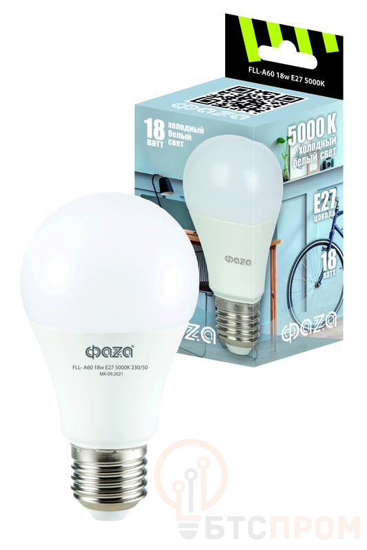 Лампа светодиодная ФАZА 5038417 FLL-A60. Мощность 18Вт. Цоколь E27. Холодный белый свет 5000K. Напряжение 230В. Частота 50Гц. Профессиональное решение для коммерческих и промышленных помещений. Обеспечивает яркое равномерное освещение больших площадей.