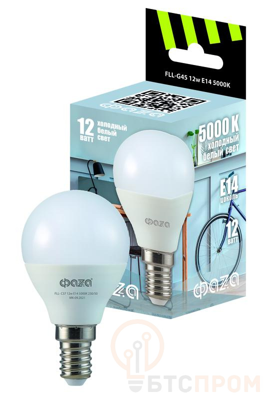 Лампа светодиодная ФАZА 5038592 FLL-G45. Мощность 12Вт. Цоколь E14. Холодный белый свет 5000K. Напряжение 230В. Частота 50Гц. Универсальное решение для общего освещения. Качественные компоненты обеспечивают стабильную работу.