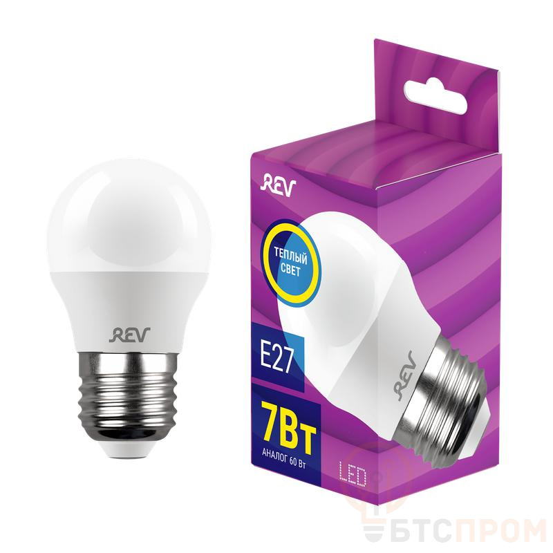 Светодиодная лампа REV 32342 6. Форма G45, 7Вт. Шарообразная. Теплый белый свет 2700K. Цоколь E27. Световой поток 600 лм. Напряжение 180-240В. Универсальное решение для общего освещения. Экономия энергии и длительный срок службы.