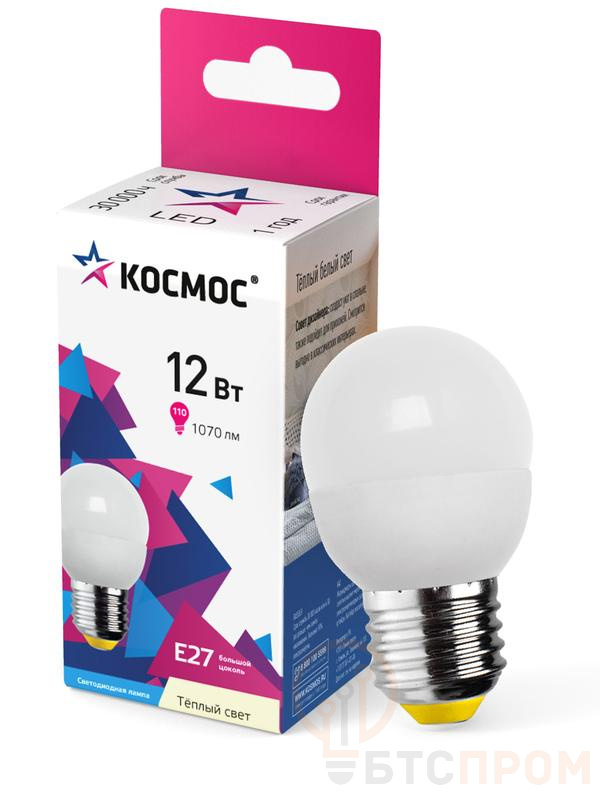 Светодиодная лампа 12Вт. Форма шара (G45), цоколь E27. Теплый белый свет (3000K). Световой поток 1070 лм. Создает уютную и расслабляющую атмосферу. Напряжение 174-265В.