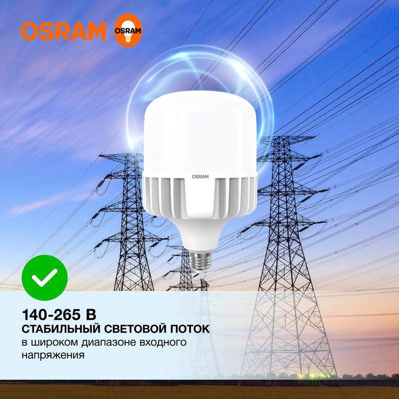Высокомощная лампа LEDVANCE 4099854121579 HW на 65Вт с холодным белым светом 6500K и световым потоком 6500 лм. Цоколь E27/E40 обеспечивает универсальность применения. Угол пучка 200 градусов создает равномерное освещение больших площадей. Широкий диапазон рабочих напряжений 140-265В гарантирует надежную работу в условиях нестабильного электроснабжения. Коэффициент мощности ≥0.9 соответствует высоким стандартам энергоэффективности. Алюминиевый корпус способствует эффективному отводу тепла и увеличивает срок службы. Лампа заменяет традиционные источники света мощностью 650Вт. Идеальна для освещения промышленных объектов, логистических центров и спортивных сооружений.