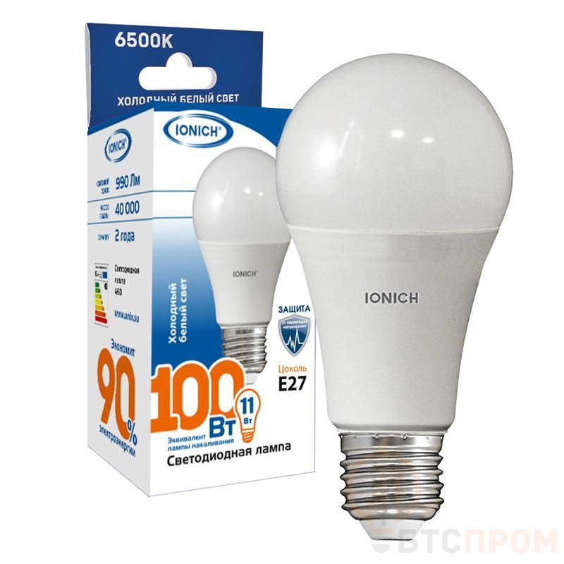 Лампа IONICH 1559 ILED-SMD2835-A60-11-990-220-6.5-E27 на 11Вт с холодным белым светом 6500K. Световой поток 990 лм. Цоколь E27. Напряжение 220В. Яркое освещение для технических помещений и зон с повышенными требованиями к видимости.