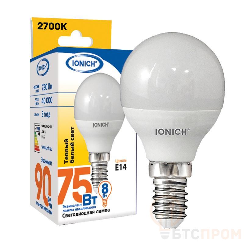 Лампа светодиодная ILED-SMD2835-P45-8-720-230-2.7-E14 P45 8Вт Шар 2700К тепл. бел. Е14 230В IONICH 1642