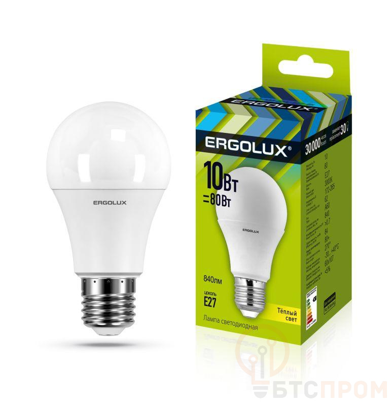 Лампа светодиодная LED-A60-10W-E27-3000K 10Вт грушевидная 3000К тепл. бел. E27 180-240В ЛОН Ergolux 12148