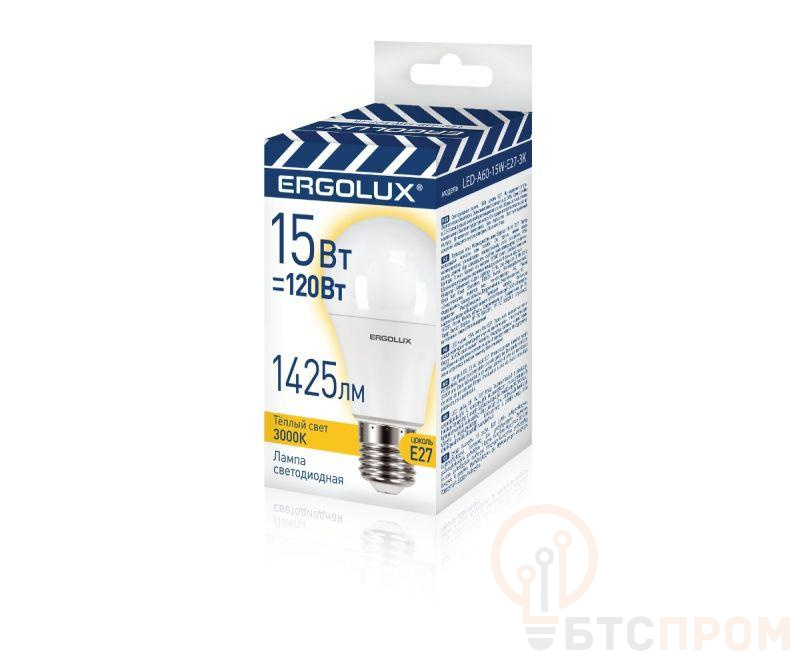 Светодиодная лампа ERGOLUX может быть применена в жилых, офисных и производственных в помещениях, а также в уличных светильниках со степенью защиты не менее IP54. LED лампа, Мощность 15 Вт, Эквивалент лампы накаливания 120 Вт, Цоколь E27, Цветовая температура 3000 К, Световой поток 1425 лм, Угол светового пучка 270, Индекс цветопередачи 80+