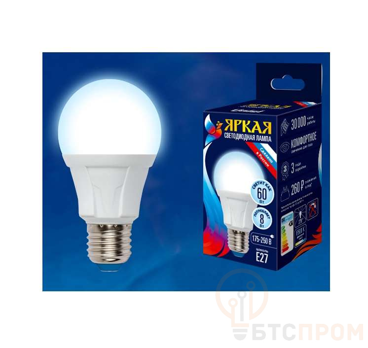 Лампа светодиодная LED-A60 8W/DW/E27/FR PLP01WH Яркая 8Вт грушевидная матовая 6500К холод. бел. E27 (упак. картон) Uniel UL-00002003