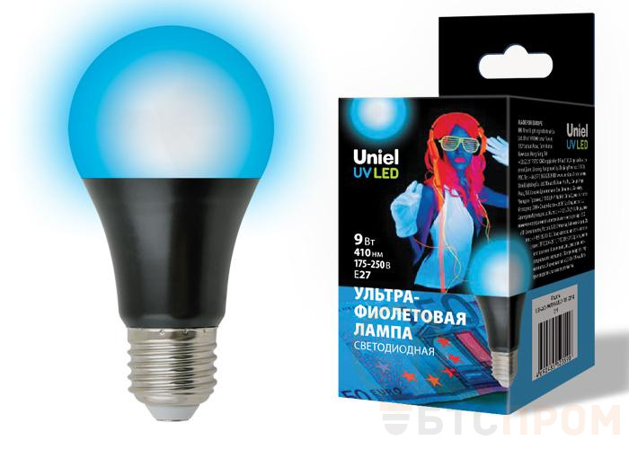 Лампа светодиодная Uniel LED-A60-9W/UVAD/E27/FR PLZ07BK – ультрафиолетовая лампа для дискотек и дезинфекции. Мощность 9 Вт. Ультрафиолетовый свет UVA (длина волны ~410 нм). Создает флуоресцентное свечение белых и неоновых материалов. Может использоваться для подсветки в клубах, на вечеринках, а также для проверки документов, банкнот. Черная колба. Цоколь E27. Упаковка - картон. Uniel - свет для особых эффектов.