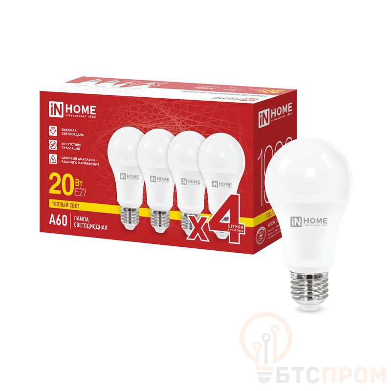 Лампа светодиодная LED-A60-VC 4PACK 20Вт грушевидная 3000К E27 1900лм 230В (уп.4шт) IN HOME 4690612063058