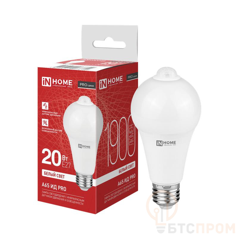 Лампа светодиодная LED-A65 ИД-PRO 20Вт 4000К E27 1900лм 230В 5м 35сек с инфракрасным датчиком и датчиком освещенности IN HOME 4690612067810
