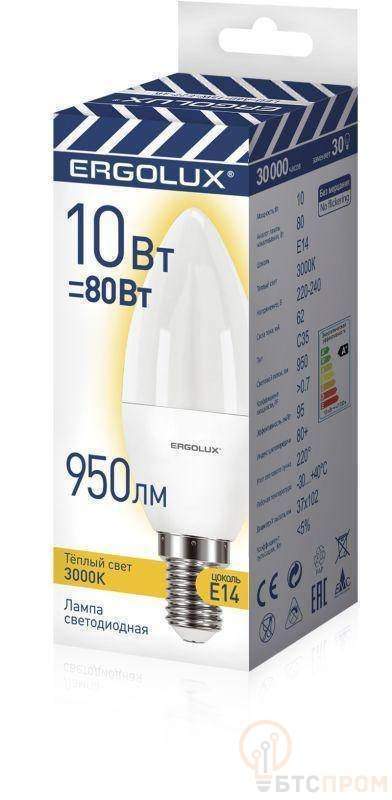 Светодиодная лампа ERGOLUX может быть применена в жилых, офисных и производственных в помещениях, а также в уличных светильниках со степенью защиты не менее IP54. LED лампа, Мощность 10 Вт, Эквивалент лампы накаливания 80 Вт, Цоколь E14, Цветовая температура 3000 К, Световой поток 950 лм, Угол светового пучка 220, Индекс цветопередачи 80+