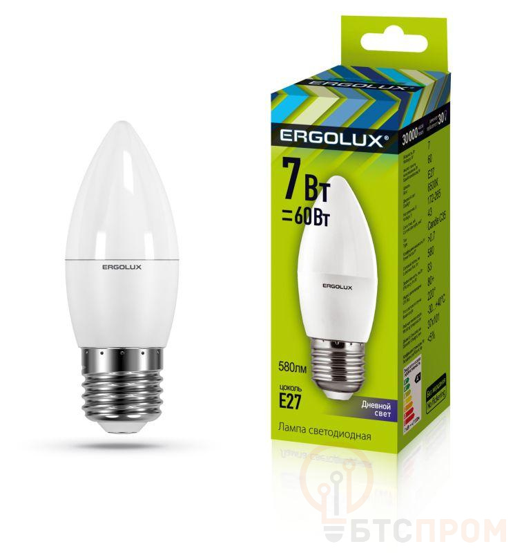 Лампа светодиодная LED-C35-7W-E27-6K Свеча 7Вт E27 6500К 172-265В Ergolux 13299 фото в каталоге от BTSprom.by