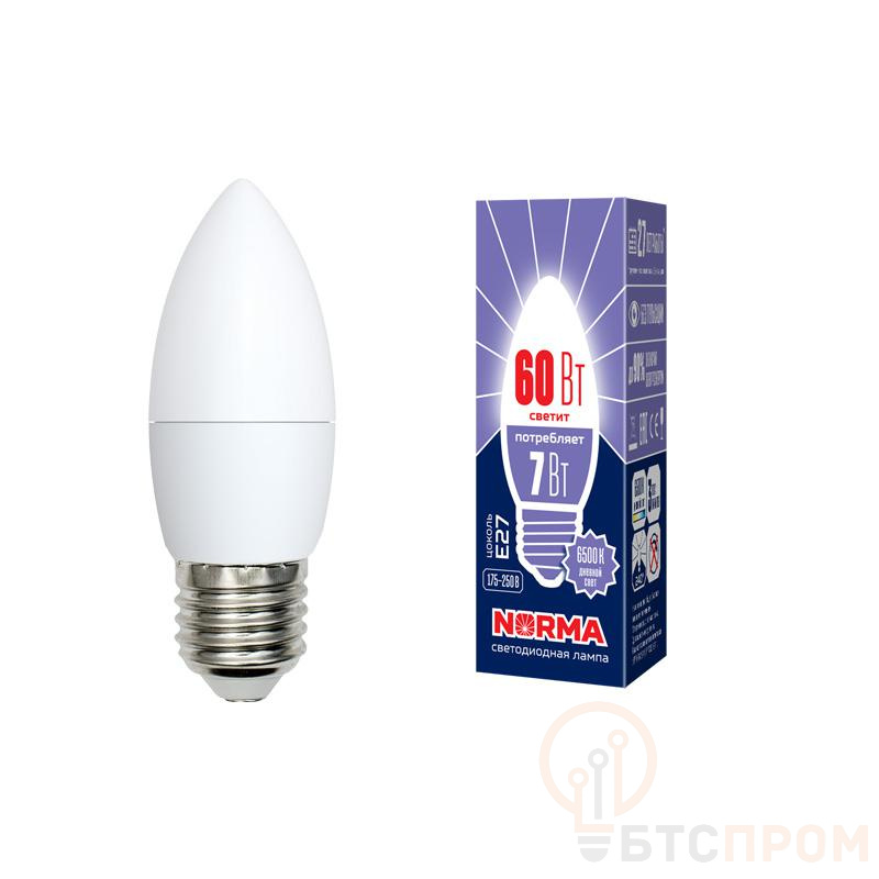 Лампа светодиодная Volpe LED-C37-7W/DW/E27/FR/NR Norma – лампа-свеча с холодным светом и цоколем E27. Мощность 7 Вт. Холодный белый свет (6500K). Матовая колба (FR). Форма "свеча". Цоколь E27. Серия Norma. Картонная упаковка. Напряжение 220-240 В. Volpe - холодный свет для стандартных патронов.