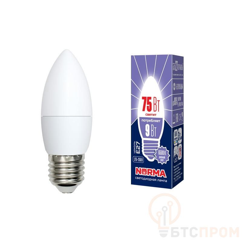 Лампа светодиодная Volpe LED-C37-9W/DW/E27/FR/NR Norma – лампа-свеча с холодным светом и цоколем E27. Мощность 9 Вт. Холодный белый свет (6500K). Матовая колба (FR). Форма "свеча". Цоколь E27. Серия Norma. Картонная упаковка. Напряжение 220-240 В. Volpe - для просторных помещений, требующих яркого света.