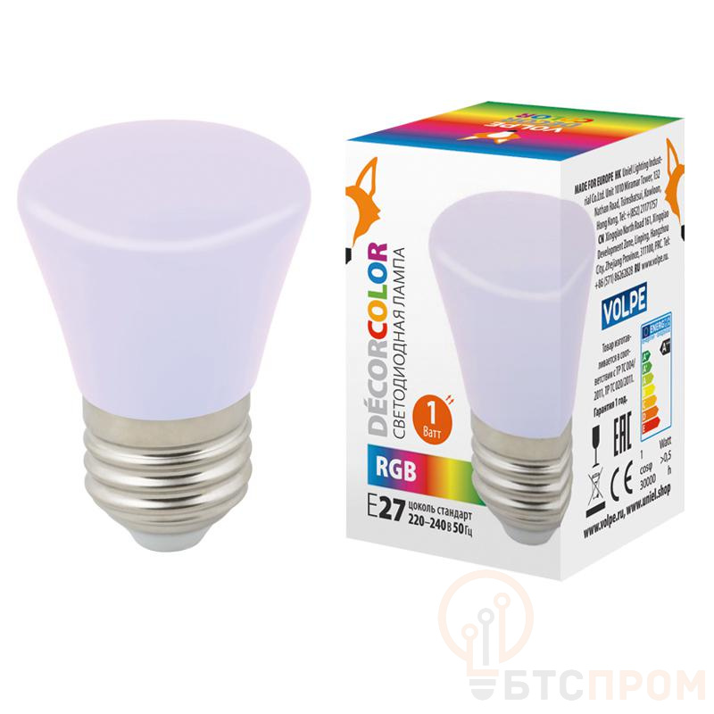 Лампа светодиодная Volpe LED-D45-1W/RGB/E27/FR/С BELL Колокольчик – декоративная лампа-колокольчик с RGB-подсветкой. Мощность 1 Вт. Многоцветная RGB-подсветка. Матовая колба (FR). Форма "колокольчик". Цоколь E27. Декоративное назначение (С). Серия "BELL". Упаковка - картон. Напряжение 220-240 В. Volpe - для создания разноцветных динамических эффектов.