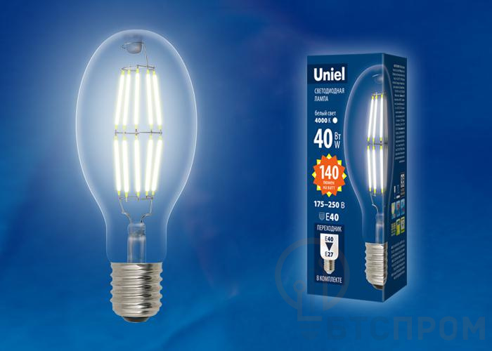 Лампа светодиодная Uniel LED-ED90-40W/DW/E40/CL GLP05TR – сверхмощная промышленная филаментная лампа. Мощность 40 Вт. Холодный белый свет (6500K). Прозрачная колба (CL). Цоколь E40. Упаковка - картон. Напряжение 220-240 В. Uniel - для освещения огромных пространств: ангаров, вокзалов, цехов.