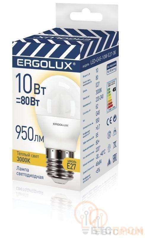 Светодиодная лампа ERGOLUX может быть применена в жилых, офисных и производственных в помещениях, а также в уличных светильниках со степенью защиты не менее IP54. LED лампа, Мощность 10 Вт, Эквивалент лампы накаливания 80 Вт, Цоколь E27, Цветовая температура 3000 К, Световой поток 950 лм, Угол светового пучка 220, Индекс цветопередачи 80+