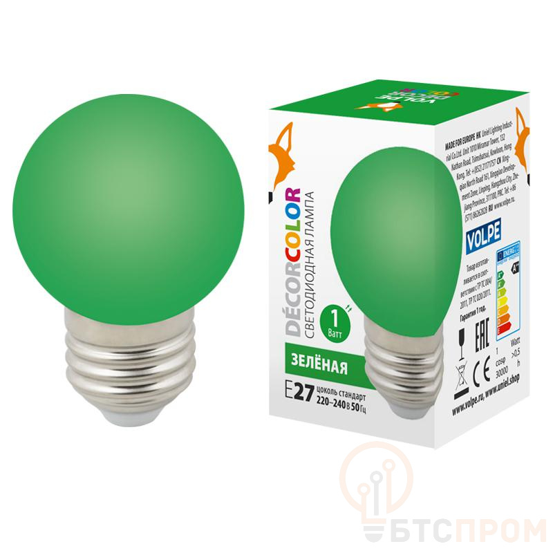 Лампа светодиодная LED-G45-1W/GREEN/E27/FR/С 1Вт шар матовая зел. E27 декоративная (упак. картон) Volpe UL-00005648