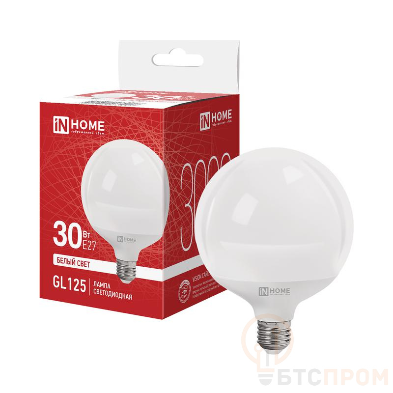 Светодиодная лампа IN HOME LED-GL125-VC — это современное и энергоэффективное решение для основного освещения. Модель мощностью 30 Вт обеспечивает яркий световой поток 3000 лм, что эквивалентно традиционной лампе накаливания мощностью свыше 200 Вт. Нейтральная цветовая температура 4000К (холодный белый свет) способствует созданию рабочей атмосферы, идеальной для концентрации.