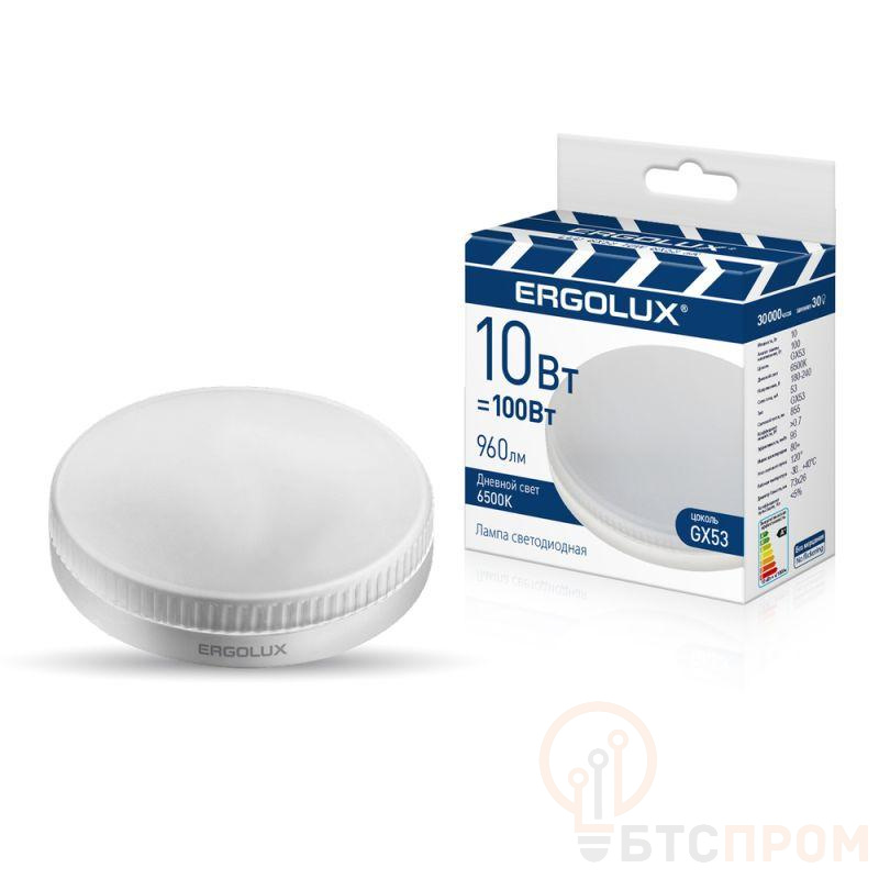 LED лампа, Мощность, Вт - 10, Напряжение, В - 180-240, Световой поток, лм - 855, Цоколь GX53, Цветовая температура, К - 6500, Угол светового пучка - 120, Индекс цветопередачи 80+, Срок службы, ч. - 30000