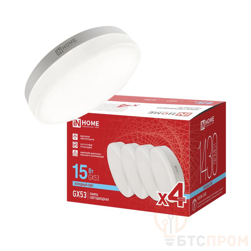 Светодиодная лампа IN HOME LED-GX53-VC — это современное и экономичное решение для встраиваемого освещения. Комплект из 4 ламп обеспечивает яркий холодный белый свет (6500К) с высокой светоотдачей 1430 люмен при потреблении всего 15Вт каждая, что позволяет значительно снизить энергозатраты.