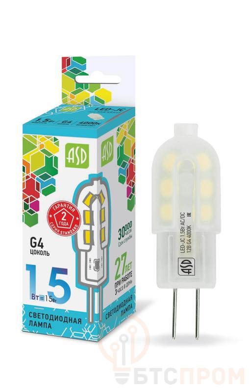 Светодиодная лампа ASD капсульной формы в силиконовом корпусе серии LED-JC-standard подойдет для люстр и светильников с плафонами диаметром от 10 мм и высотой от 35 мм. Применяется для декоративной подсветки. Является экономичной заменой галогенных капсульных ламп c цоколем G4. Снижает затраты на энергопотребление до 50%. Класс энергоэффективности – А, низкая теплоотдача, безопасный коэффициент пульсации. Способна бесперебойно работать при температуре от -40°C до +50°C в течение 30 000 часов. Линейка ламп ASD серии LED-JC-standard представлена в диапазоне мощностей от 1.5 Вт до 5 Вт и цветовой температуре 3000 К и 4000 К. Гарантия 2 года.