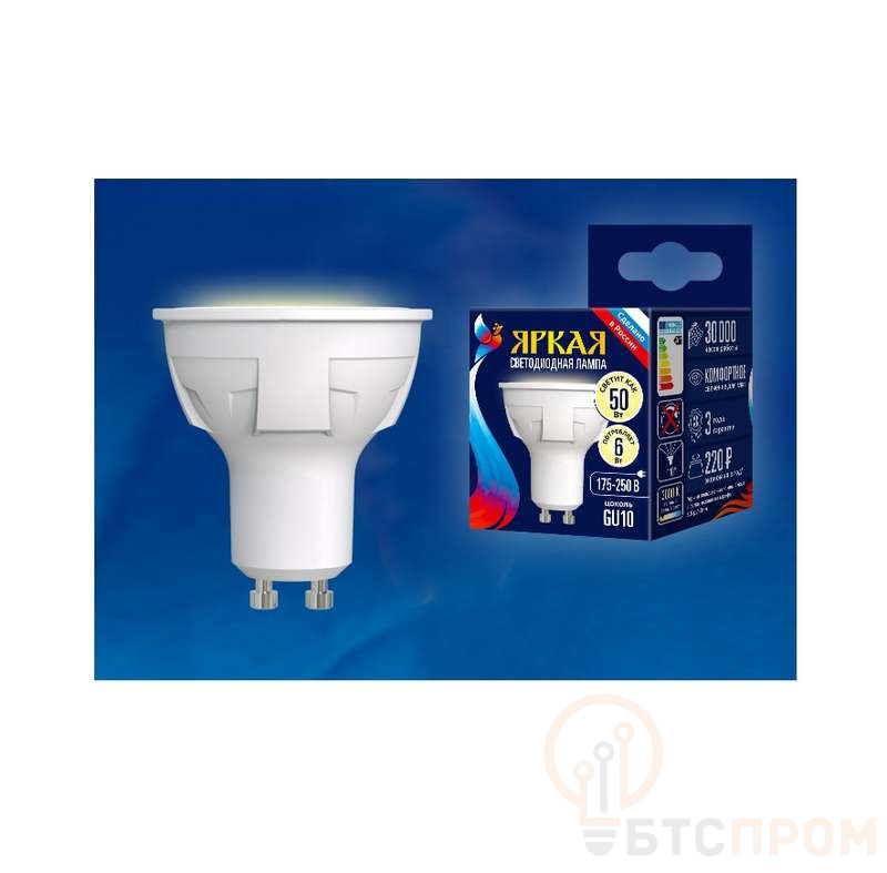 Лампа светодиодная LED-JCDR 6W/WW/GU10/FR PLP01WH Яркая JCDR 6Вт матовая 3000К тепл. бел. GU10 (упак. картон) Uniel UL-00002423