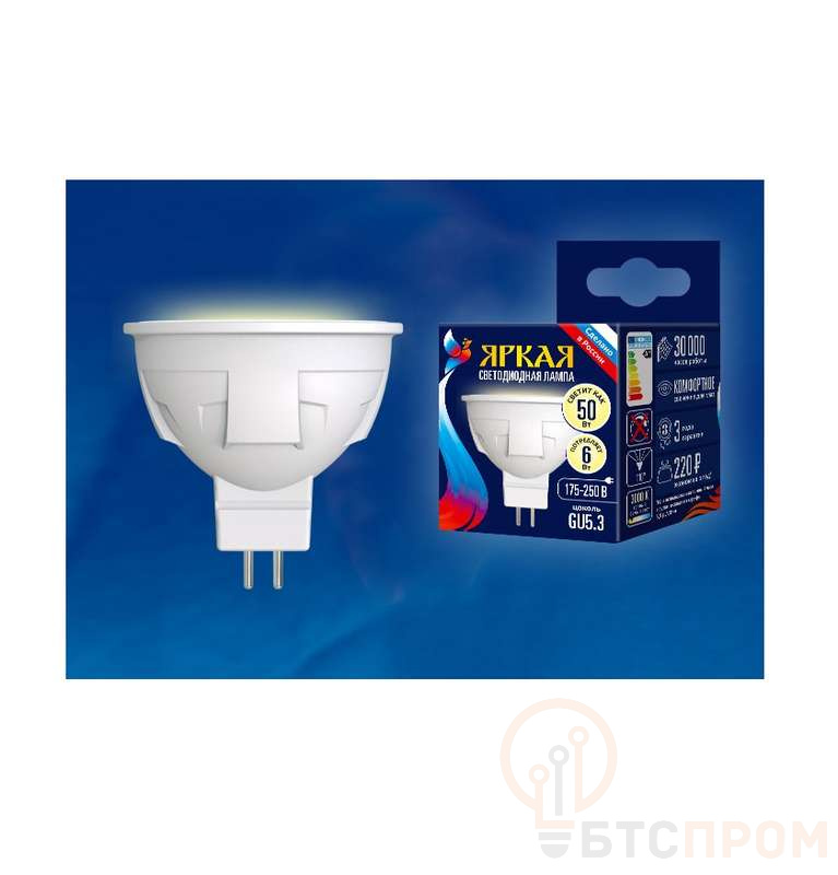 Лампа светодиодная LED-JCDR 6W/WW/GU5.3/FR PLP01WH JCDR ЯРКАЯ матовая 3000К тепл. бел. (упак. картон) Uniel UL-00002424