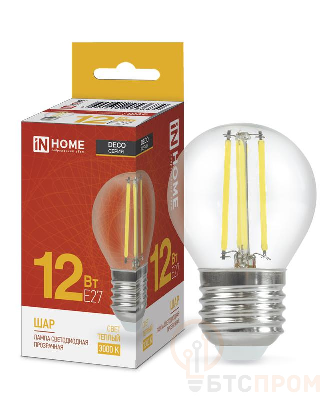 Лампа «Шар» IN HOME на 12Вт (E27, 230В), тёплый свет 3000K, 1350 лм, прозрачная. Универсальный дизайн.