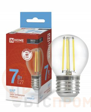 Лампа светодиодная LED-ШАР-deco 7Вт шар прозрачная 6500К холод. бел. E27 810лм 230В IN HOME 4690612036427