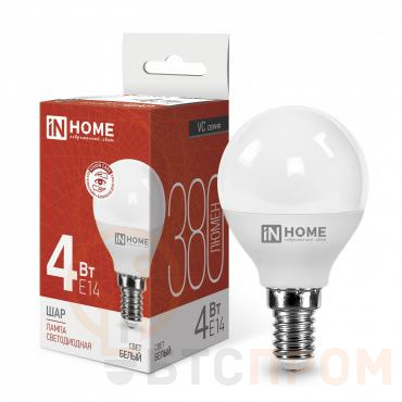 –Лампа светодиодная LED-ШАР-VC 4Вт шар 4000К нейтр. бел. E14 380лм 150-275В IN HOME 4690612030531