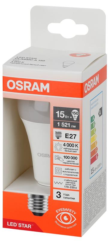 Светодиодные лампы OSRAM - разумная замена традиционным лампам накаливания или галогенным лампам. Светодиодные лампы OSRAM снижают затраты на освещение до 90% при сохранении привычного уровня освещенности. Эта лампа OSRAM серии LED Star выполнена в форме колбы A ("груша") с цоколем E27. Материал колбы - пластик, исполнение - матовое. Световой поток 1521 люмен, что соответствует лампе накаливания на 150 Вт. Такие лампы применяются для внутреннего освещения, хотя в закрытом светильнике можно использовать и на улице. Эта лампа излучает нейтральный белый свет, угол пучка - широкий. Качество света на высоте: низкие пульсации защищают глаза, а высокий индекс цветопередачи позволяет видеть мир в его истинном цвете. Кроме того, лампы OSRAM полностью безопасны для здоровья, поскольку в них нет опасных материалов по европейскому стандарту RoHS, а также они не производят вредных электромагнитных излучений, что подтверждено ЭМС (сертификат электромагнитной совместимости). LED Star - это продвинутая серия OSRAM, среди ее особенностей: 1. Совместимость с выключателем с подсветкой - другие лампы могут вспыхивать или тлеть при работе с выключателем подсветкой, а OSRAM LED Star будет работать как надо. 2. Широкий диапазон входного напряжения - при колебаниях напряжения в сети в пределах 170-250В лампа будет давать стабильный световой поток. Лампа будет работать и при более низком напряжении, но с меньшим количеством света. Лампа проработает долго: срок службы - 40000 часов, 3 года гарантии. Светодиодные лампы OSRAM - умный выбор для здоровья семьи и кошелька!