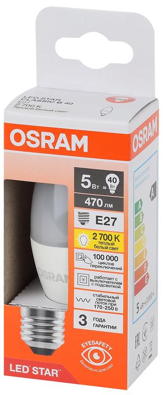 Светодиодные лампы OSRAM - разумная замена традиционным лампам накаливания или галогенным лампам. Светодиодные лампы OSRAM снижают затраты на освещение до 90% при сохранении привычного уровня освещенности. Эта лампа OSRAM серии LED Star выполнена в форме колбы B ("свеча") с цоколем E27. Материал колбы - пластик, исполнение - матовое. Световой поток 470 люмен, что соответствует лампе накаливания на 40 Вт. Такие лампы применяются для внутреннего освещения, хотя в закрытом светильнике можно использовать и на улице. Эта лампа излучает теплый белый свет, угол пучка - широкий. Качество света на высоте: низкие пульсации защищают глаза, а высокий индекс цветопередачи позволяет видеть мир в его истинном цвете. Кроме того, лампы OSRAM полностью безопасны для здоровья, поскольку в них нет опасных материалов по европейскому стандарту RoHS, а также они не производят вредных электромагнитных излучений, что подтверждено ЭМС (сертификат электромагнитной совместимости). LED Star - это продвинутая серия OSRAM, среди ее особенностей: 1. Совместимость с выключателем с подсветкой - другие лампы могут вспыхивать или тлеть при работе с выключателем подсветкой, а OSRAM LED Star будет работать как надо. 2. Широкий диапазон входного напряжения - при колебаниях напряжения в сети в пределах 170-250В лампа будет давать стабильный световой поток. Лампа будет работать и при более низком напряжении, но с меньшим количеством света. Лампа проработает долго: срок службы - 40000 часов, 3 года гарантии. Светодиодные лампы OSRAM - умный выбор для здоровья семьи и кошелька!